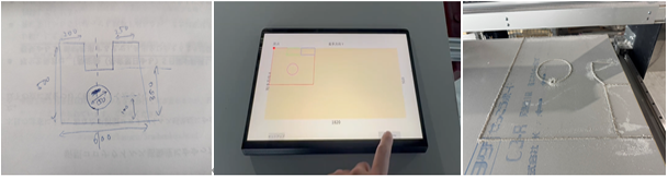 技能工が現場で描く手書き図面をスマートフォン等で撮影し、アプリが画像内の線や寸法を読み取り即座にCADデータ(SVGコード)に変換。生成したSVGコードを「SVG CAM」に直接インポートすることにより手入力の作図手間を省いたボード加工が可能となりました。